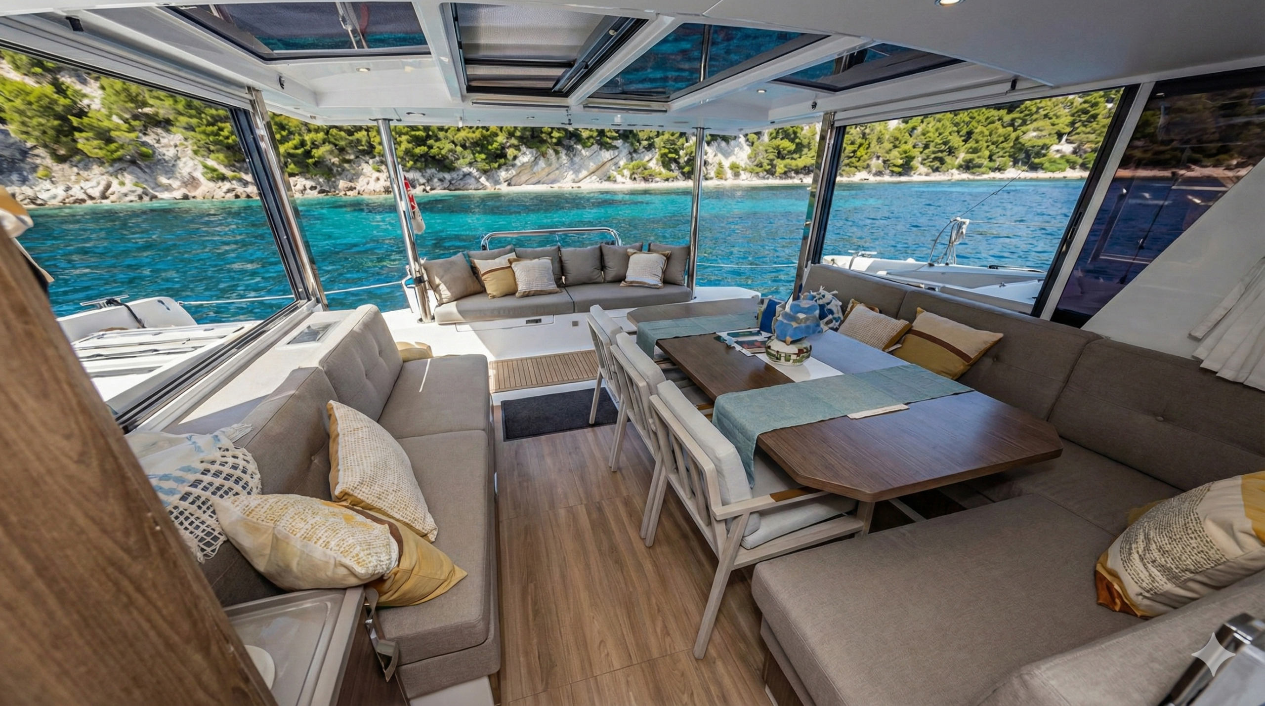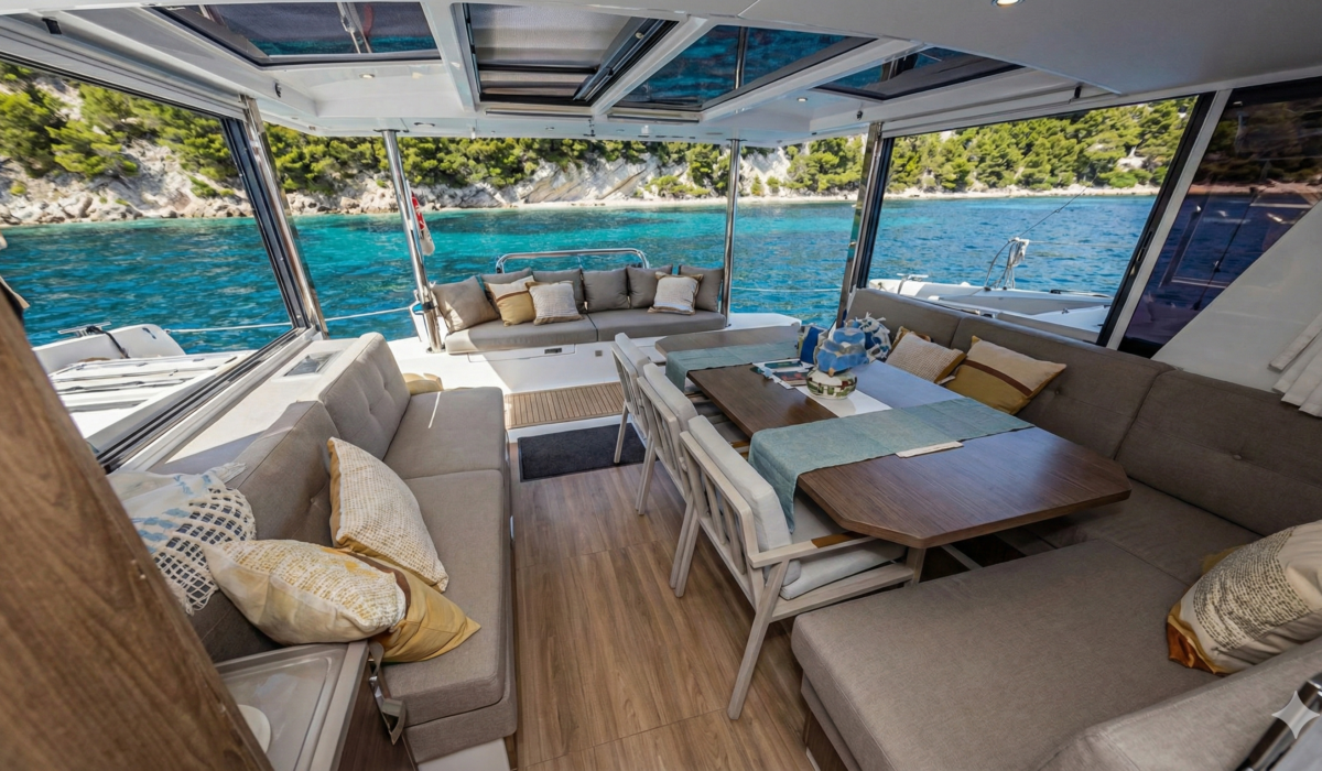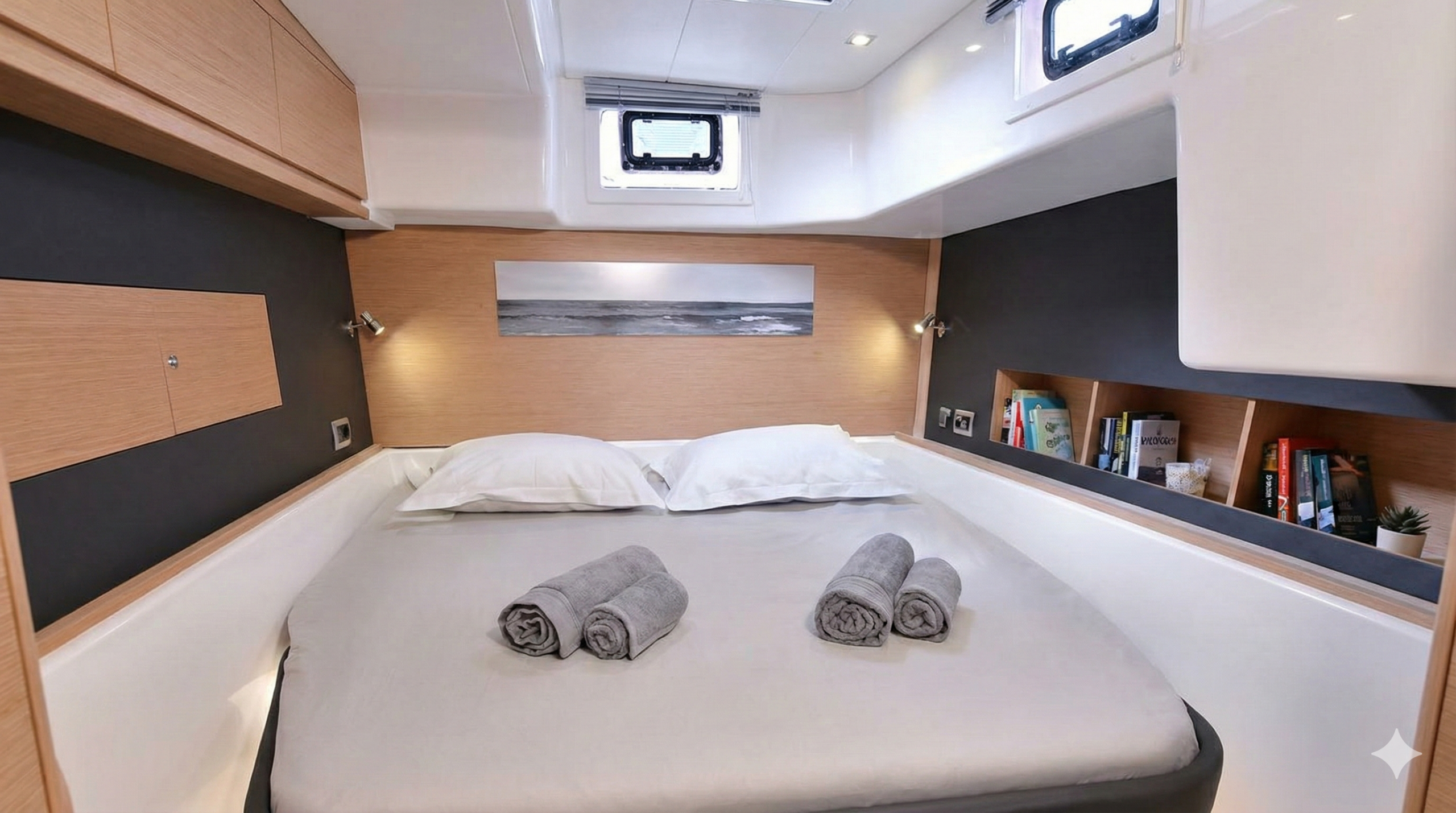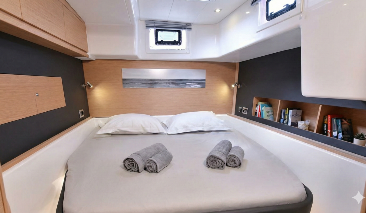 Dein Mobiles Executive-Refugium: Moderner Katamaran. Wir nutzen geräumige, moderne Katamarane für maximale Stabilität und Bewegungsfreiheit. Du verbringst 7 Nächte in einer Doppelkabine (auf Wunsch alleine) an Bord. Unsere Yacht ist nicht nur ein Transportmittel, sondern Dein geschütztes Umfeld für maximale Fokussierung, tiefgehende Selbstreflexion (Blue Mind Effekt) und Deine persönliche Transformation.